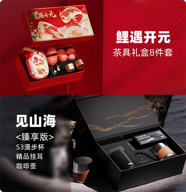“鲤遇开元茶具礼盒8件套”或“见山海咖啡套装礼盒”